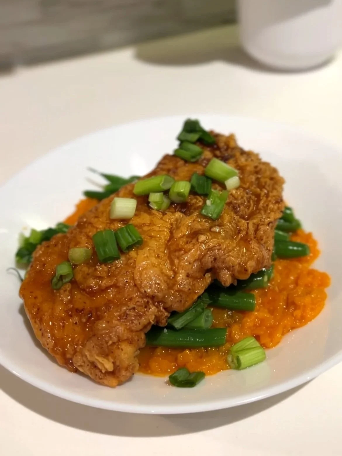 Crispy Honey Butter Glazed Fried Chicken with Sweet Potatoes & Garlic Green Beans